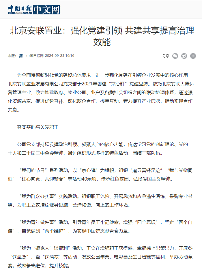 【中國日報中文網(wǎng)】北京安聯(lián)置業(yè):強化黨建引領(lǐng) 共建共享提高治理效能