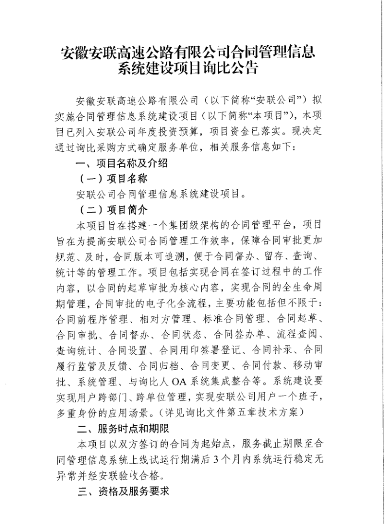 安徽安聯(lián)高速公路有限公司合同管理系統建設項目詢(xún)比公告